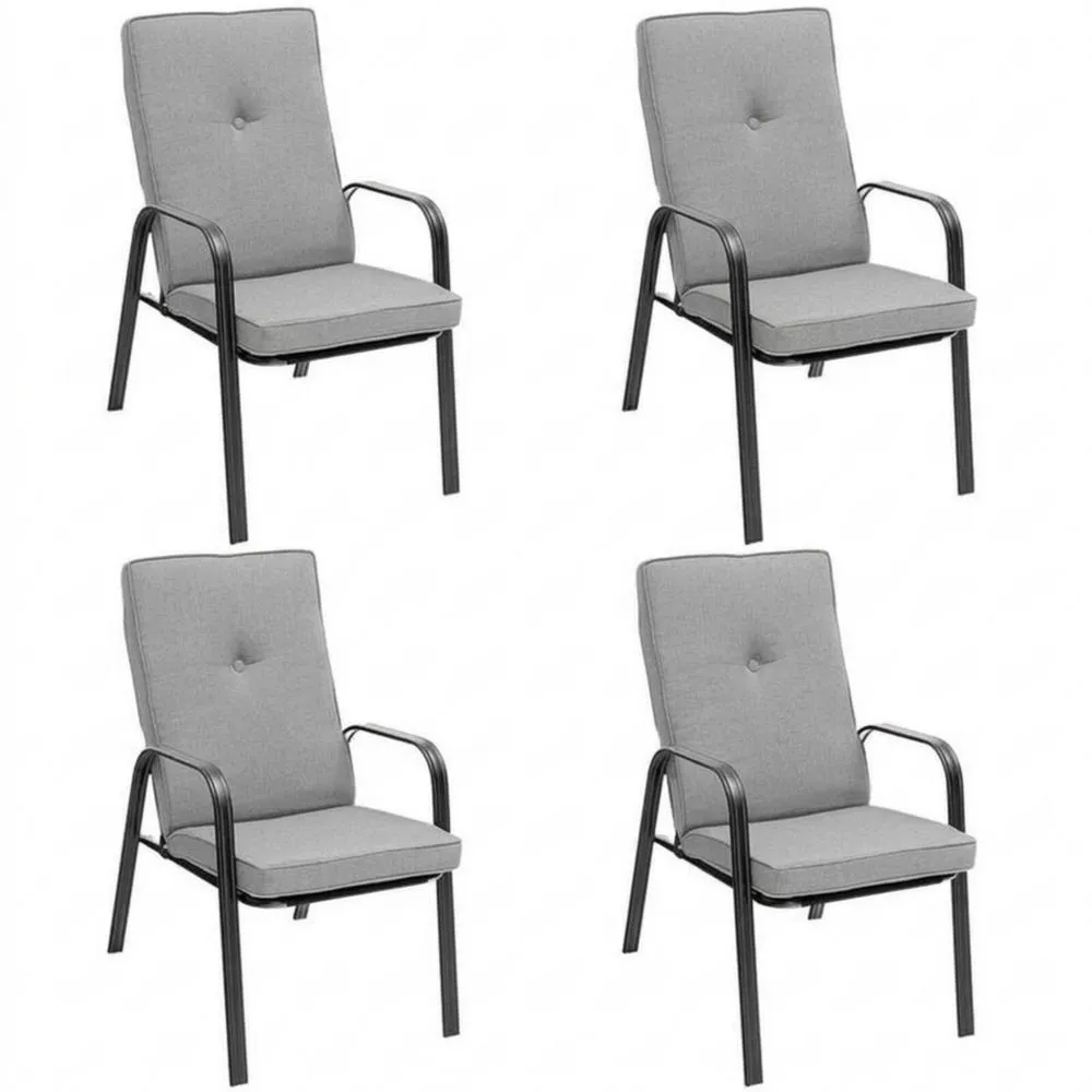 Dieses Set besteht aus vier Gartenstühlen mit Stahlrahmen. Die Kissen sind aus Polyester mit einer Polyurethanschaumpolsterung hergestellt. Der ergonomisch gestaltete Rücken ist ebenfalls gut gepolstert. Die Stühle sind nicht verstellbar, benötigen keine Montage und sind für den Einsatz im Freien geeignet.