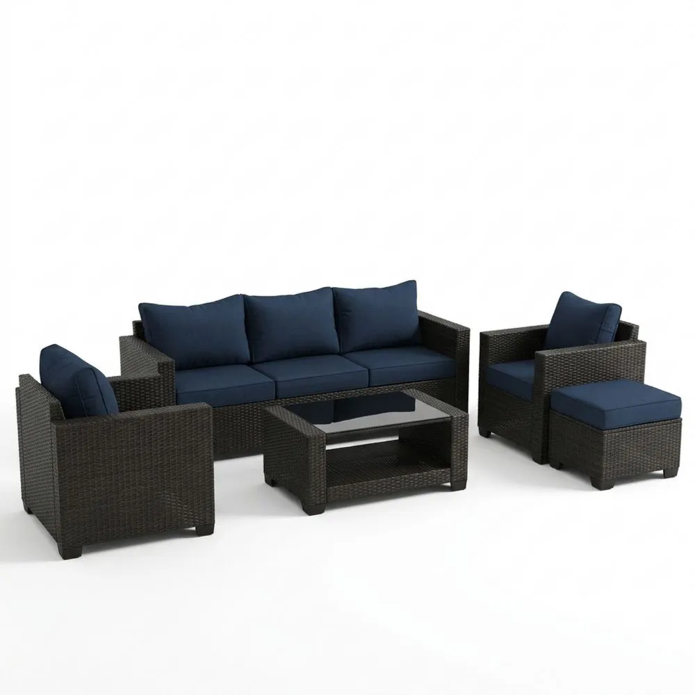 5-teiliges Garten-Sofa-Set aus Rattan mit blauen Polstern und Glastisch