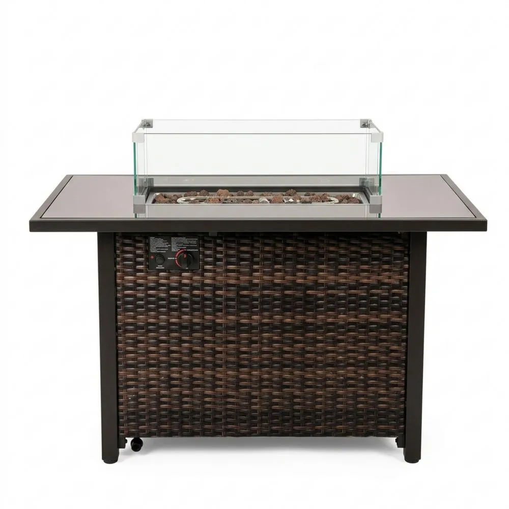 Die Feuerstelle besteht aus einem Stahlrahmen und einer wetterbeständigen Polyethylen-Rattanverkleidung. Die Tischplatte besteht aus 6 mm dickem gehärtetem Sicherheitsglas.