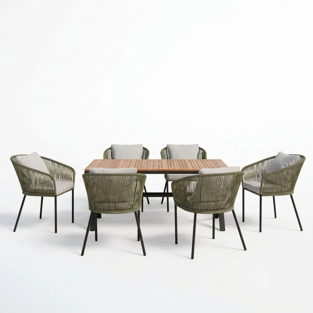 Garten-Esstisch-Set aus Teakholz, Stahl und Kunstfaser, braun/grün
