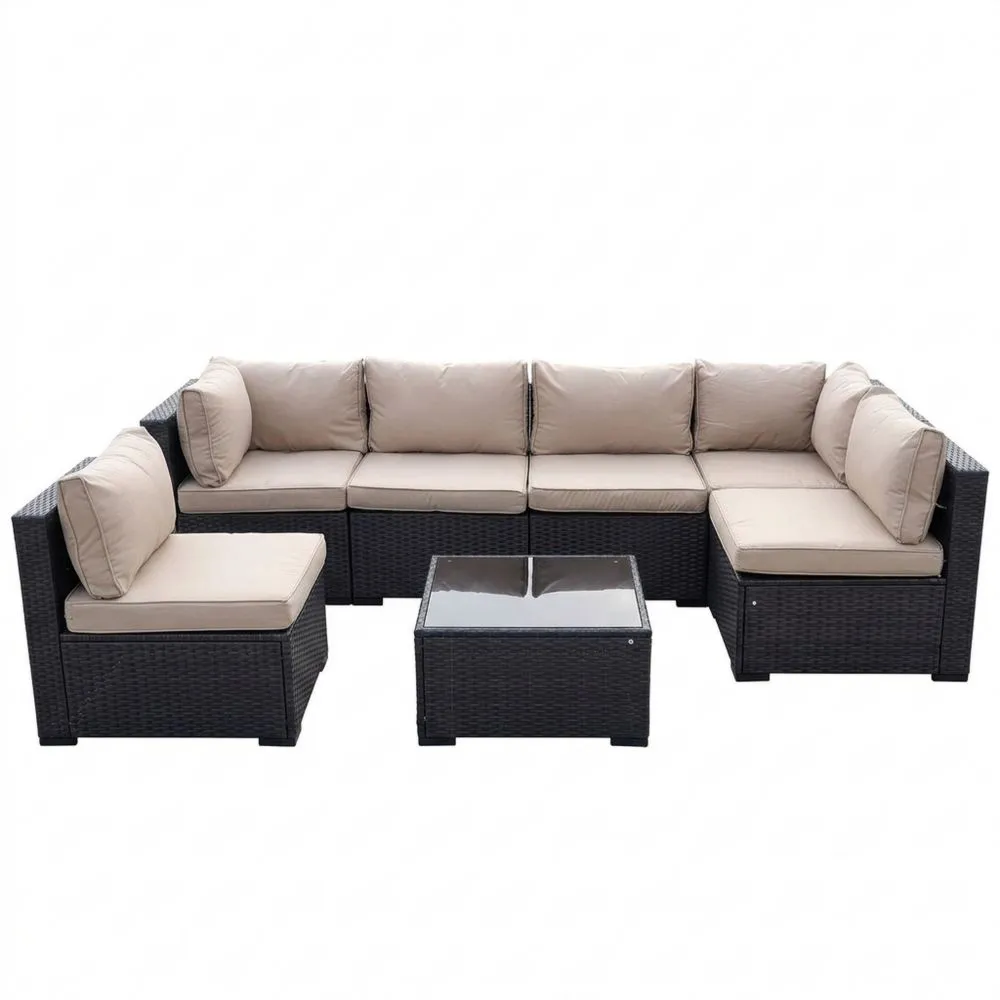 Produkte: 4 Mittelteile, 2 Eckteile, 1 Couchtisch mit Glasplatte, Sitz- und Rückenkissen