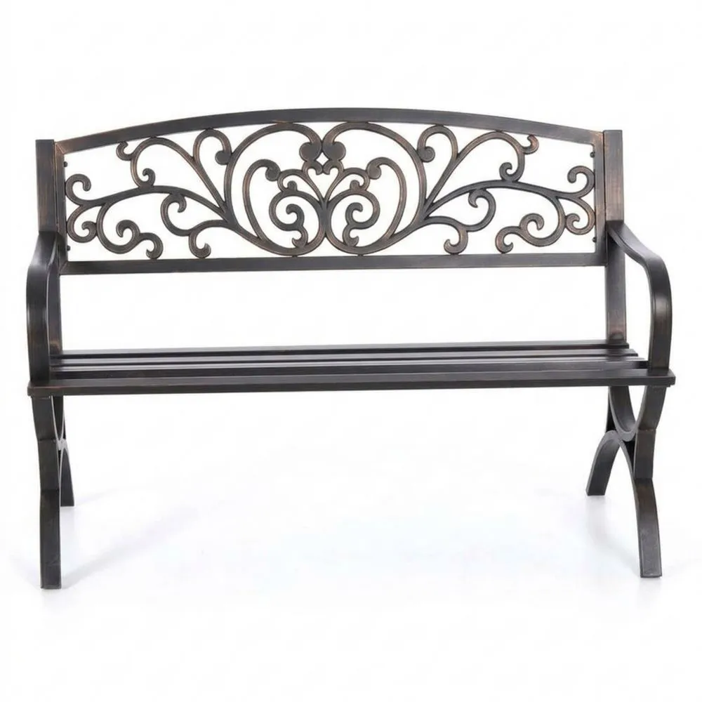 Diese Gartenbank besteht aus Stahl mit einer Gusseisen-Rückenlehne. Die Bank hat eine Länge von 125 cm, eine Breite von 54 cm und eine Höhe von 87 cm. Das Gewicht beträgt 12 kg. Die Oberfläche ist schwarz und pulverbeschichtet, was sie wetterbeständig macht. Geeignet für den Außenbereich.